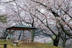 門を入った所に白鳥の日時計。今日は役に立っていないけど。 春休み中はスタンプラリーが行なわれているようで、ブースが出ていた。 フラワーパーク入口の桜が、ここからでも見える。