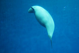 前回「セレナはフィリピンから友好のシンボルとして贈られた」と書いたが、 正確に書くと、フィリピンで、おそらく台風の影響で親とはぐれてしまったところを、 ジュゴンの調査に来ていた鳥羽水族館の調査団に保護された。 まだ小さかったので、調査団が1年間現地で飼育しており、 そういった経緯もあってフィリピン政府から寄贈され、 引き続き鳥羽水族館のスタッフが育てることになったのだそうだ。 ジュゴンの隣の水槽に、スナメリが3頭いる。 さっきのスナメリが出産間近なので、移されたほかのスナメリたちだ。